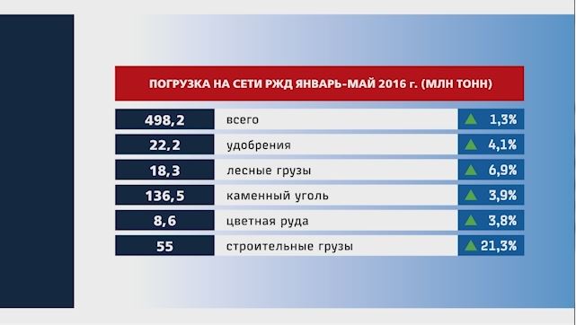 На 3,1% выросла в мае погрузка на сети РЖД в сравнении с аналогичными данными прошлого года. Общий объём – 102,9 млн тонн А в целом за 5 месяцев года погрузка достигла 498,2 млн тонн, что на 1,3% выше аналогичных данных 2015 г. Прирост показали такие грузы, как каменный уголь, химические и минеральные удобрения, лес, строительные материалы, зерно.