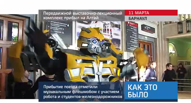 Танцевальным флешмобом с участием робота отметили прибытие в Алтайский край передвижного выставочно-лекционного комплекса. Его работа приурочена к 80-летию ревизорского аппарата РЖД.