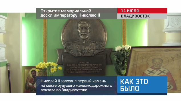 В зале железнодорожного вокзала Владивостока открыли памятную доску с барельефом императора Николая II. Открытие памятной доски приурочено к 99-й годовщине гибели царской семьи. Николай II заложил первый камень на месте будущего железнодорожного вокзала.