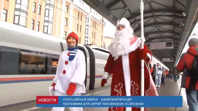 В «Волшебный рейс» накануне из Москвы в Санкт-Петербург отправился скоростной поезд «Сапсан» №760. Пассажиров поздравляли Снеговик и Дед Мороз. В пути следования они создавали праздничную атмосферу, с героями можно было сделать моментальное фото. Для детей они провели игры и конкурсы, а также принимали новогодние желания. Исполнили их по прибытию в Санкт-Петербург. На перроне детей встречали ростовые куклы и провожали к месту, где можно было получить свой подарок. Акцию «Волшебный рейс» Дирекция скоростного сообщения РЖД проводит второй год подряд.