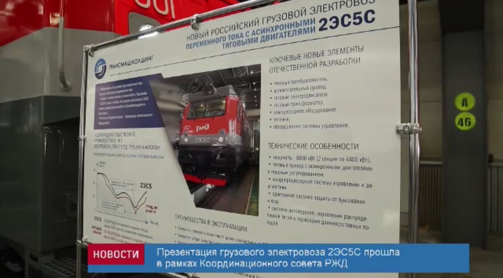 «Трансмашхолдинг» представил новый электровоз для тяжеловесного движения на Транссибе и БАМе. Глава РЖД Олег Белозёров ознакомился с локомотивом во время визита на Брянский машиностроительный завод, где прошёл координационный совет холдинга. Речь идёт о двухсекционном электровозе 2ЭС5С переменного тока с асинхронным тяговым приводом. Локомотив построили на Новочеркасском электровозостроительном заводе. Он разработан в рамках программы импортозамещения и является модификацией электровоза 2ЭС5 «Скиф». В новой машине многие ключевые компоненты заменены на российские.