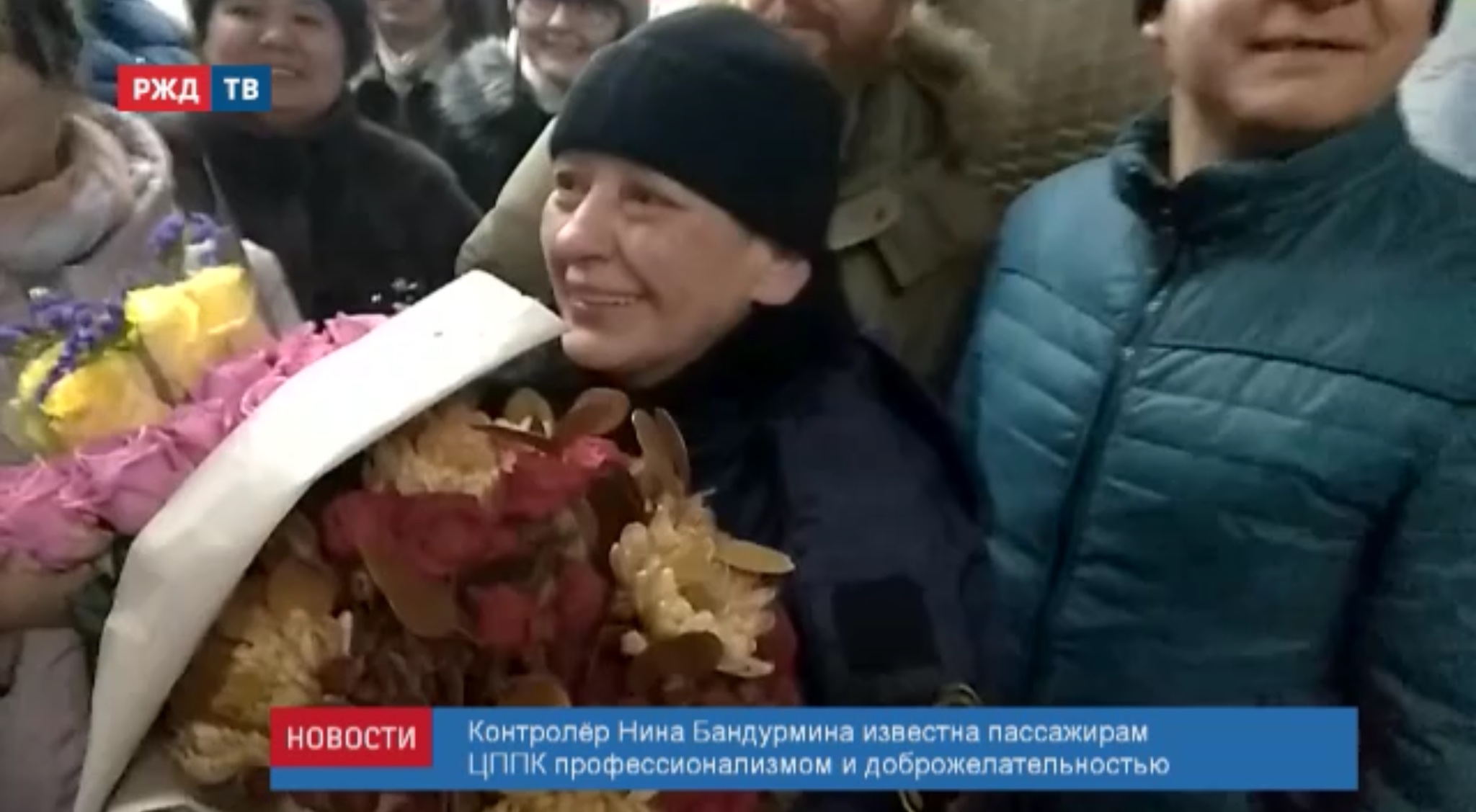 Жители Подмосковного Нахабино отметили день рождения контролёра ЦППК флешмобом. Ежедневно Нина Бандурмина желает всем пассажирам, входящим на платформу, счастья и здоровья.