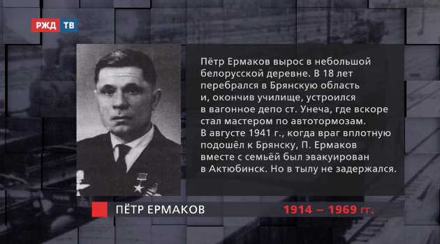 Вагонный мастер Пётр Ермаков прошёл почти всю войну в составе колонны особого резерва НКПС. Не один раз он помогал выводить из-под атаки врага эшелоны с ценными военными грузами.