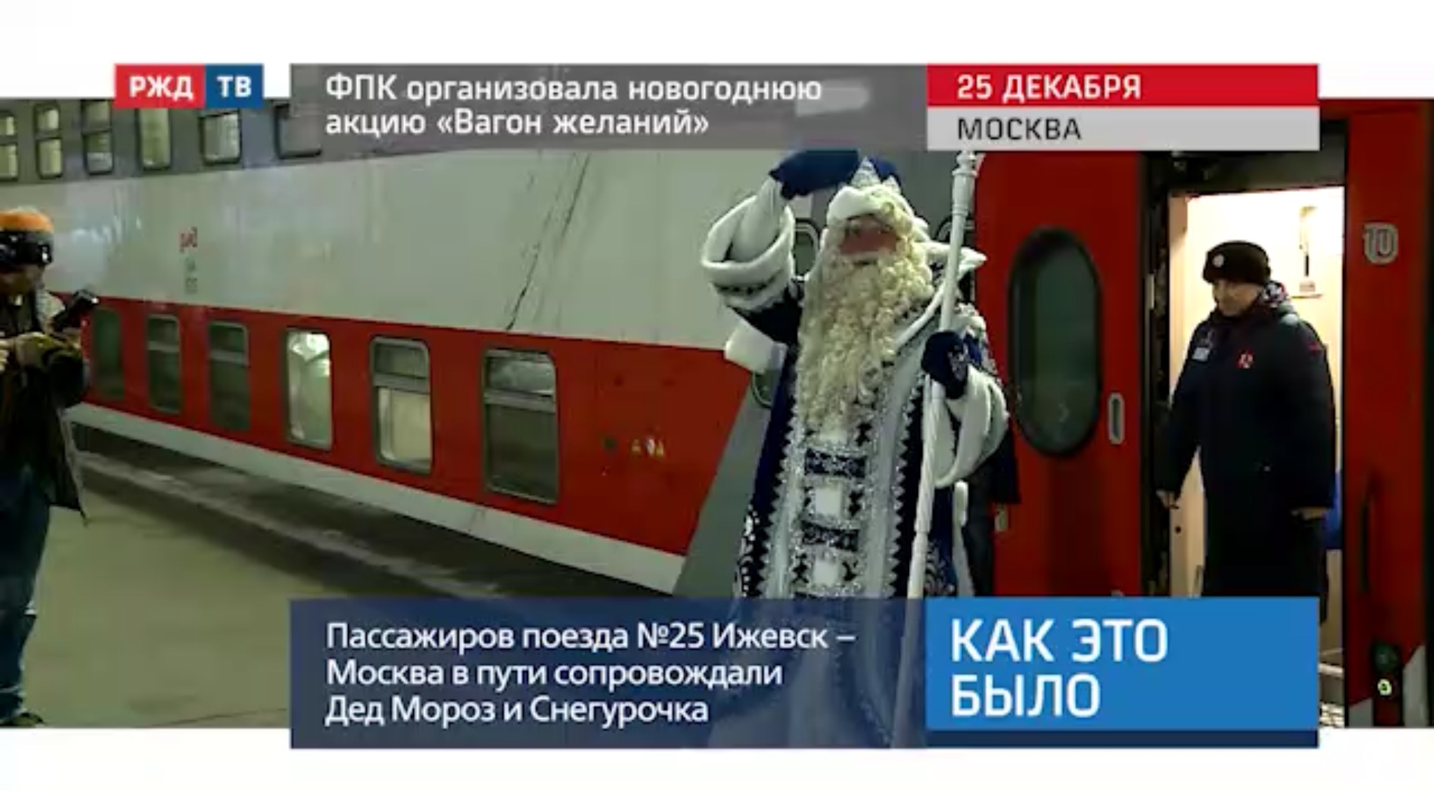 В поезде формирования АО «ФПК» Ижевск — Москва пассажирам создали праздничное настроение. Из столицы Удмуртии в столицу России путешественники отправились в компании Деда Мороза и Снегурочки. Новогоднюю акцию «Вагон желаний» устроила Федеральная пассажирская компания.