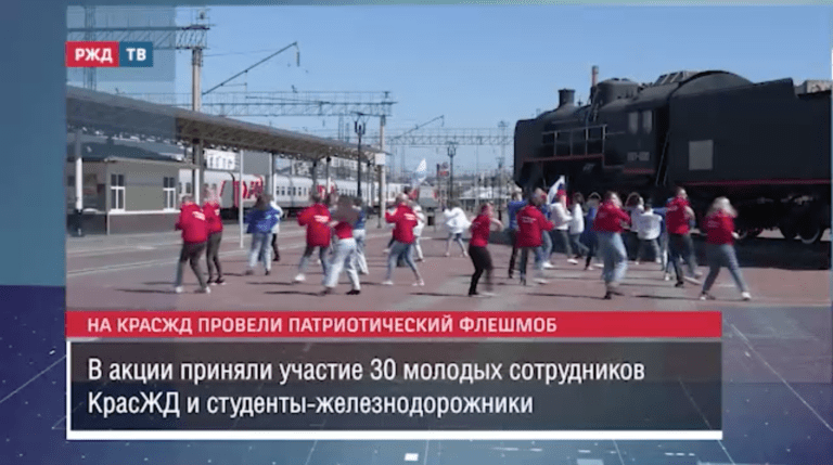 Красноярские железнодорожники провели флешмоб, посвящённый Дню России. Акция под названием «Моя Россия» состоялись на перроне вокзала Красноярска.
