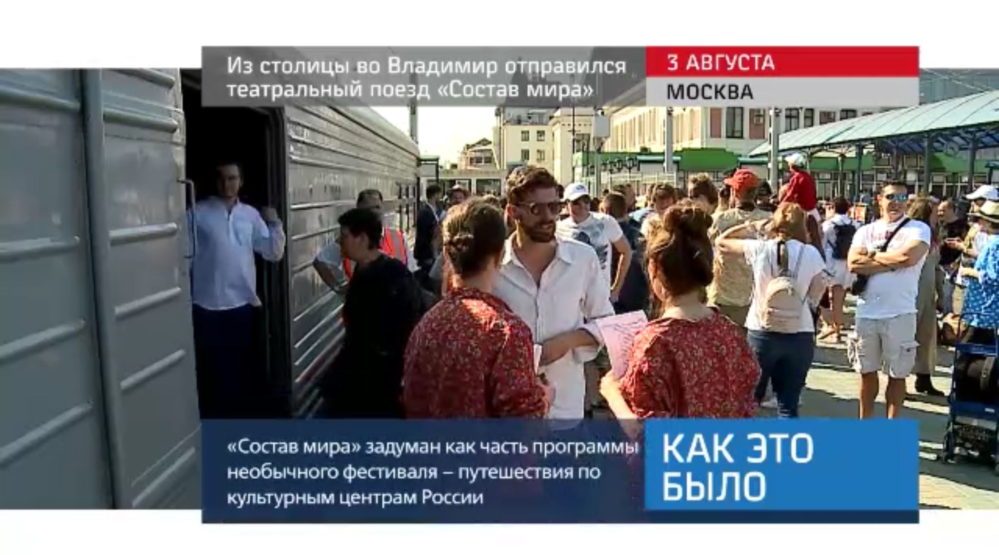 С Ярославского вокзала Москвы во Владимир отправился специальный поезд «Состав мира». В 12 вагонах едут музыканты, актёры и представители других творческих профессий. Акция проходит в рамках фестиваля «Человек мира».