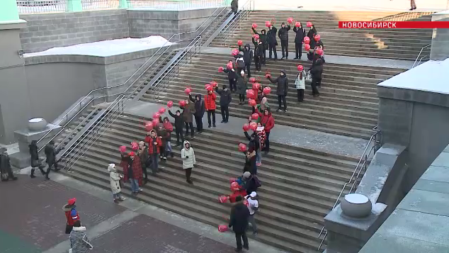 Участники выстроились на лестнице вокзала Новосибирска в форме красной ленты – символа борьбы со СПИДом